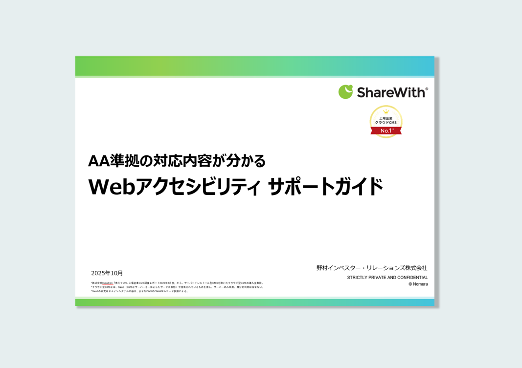 既存のコーポレートサイトIRページのみShareWithを導入。適時開示の自動連携とCMS化をワンストップで実現しました。